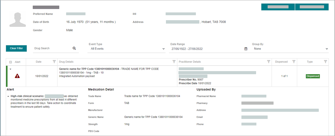 Medication history displays all medication events for this patient, including the date, the medicine details, the practitioners' details, the number of repeats dispensed (and prescribed) and the type of medication event (Prescribed or Dispensed).